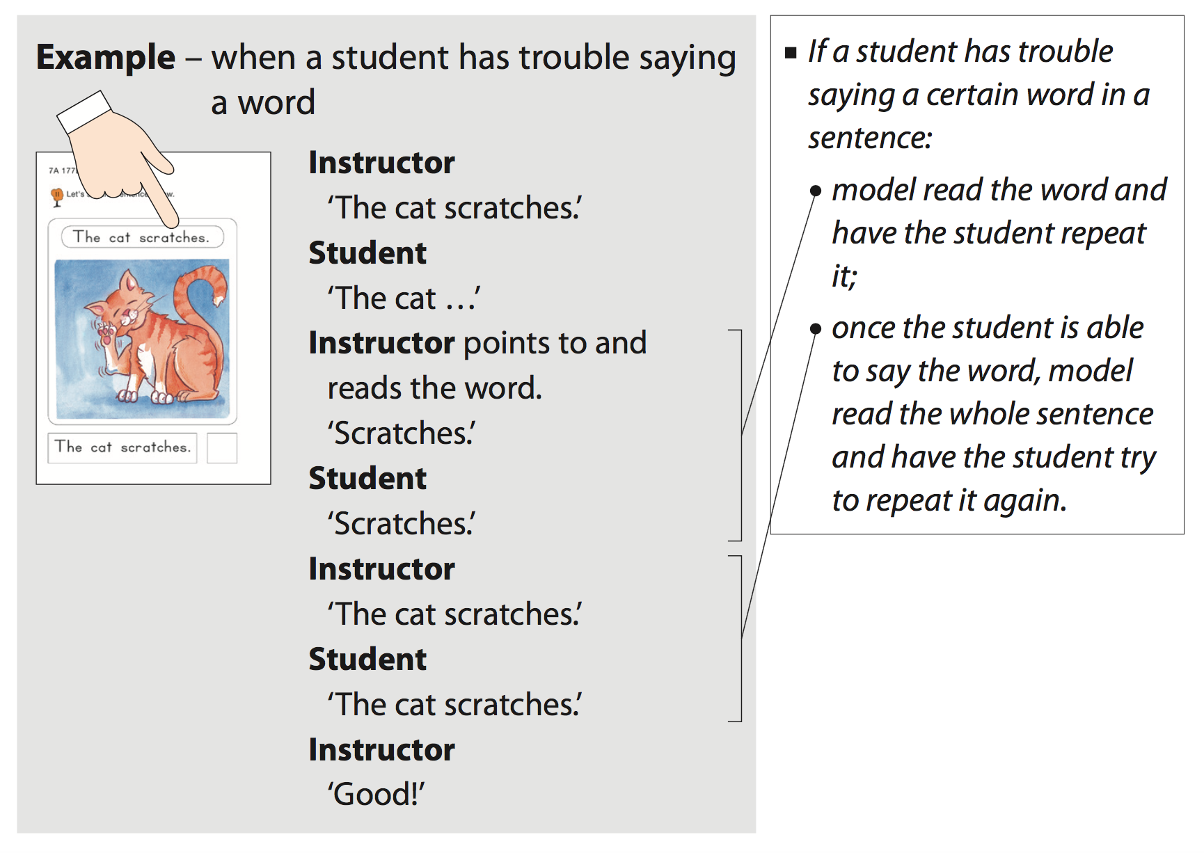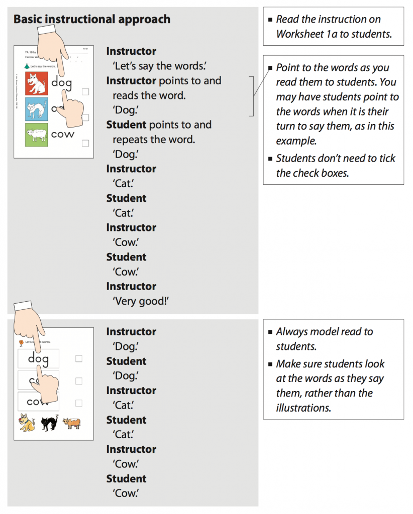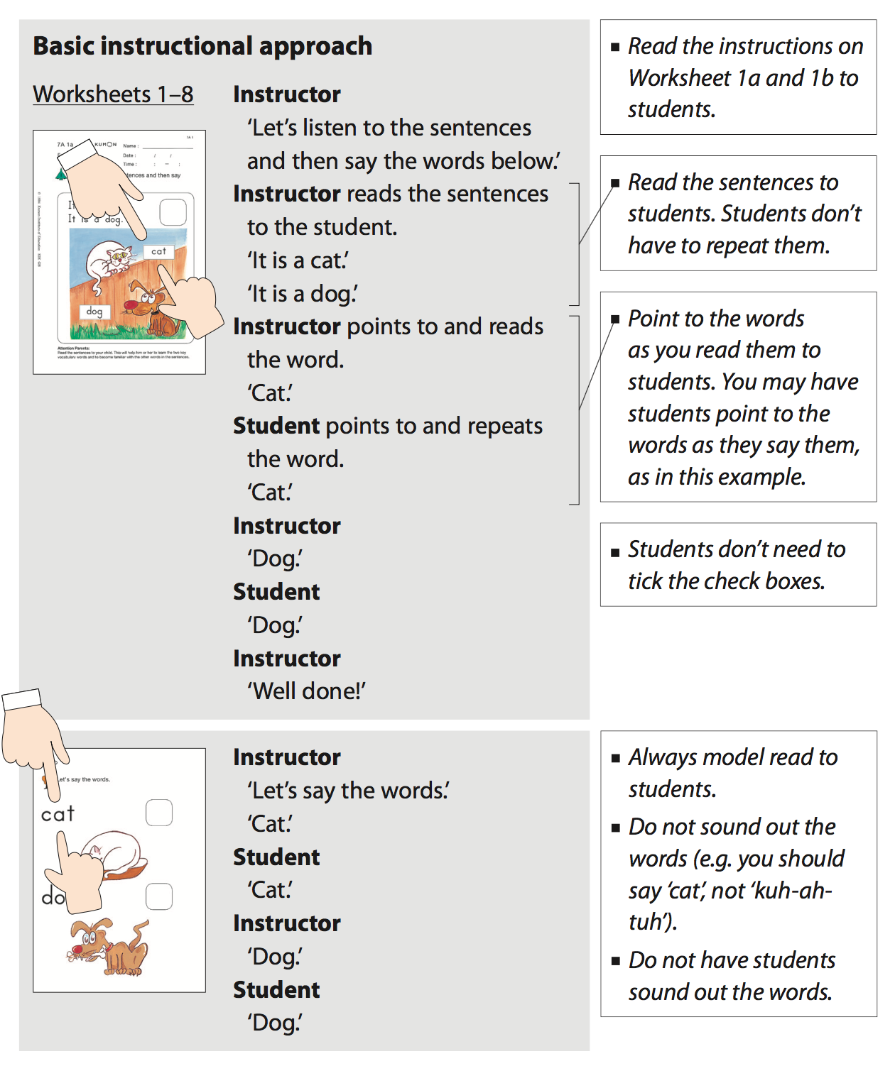 Always model read to your child using a clear voice while moving your finger smoothly across the words. When this is not possible, your child can listen to the supplementary CDs instead. Be sure to request these if needed.