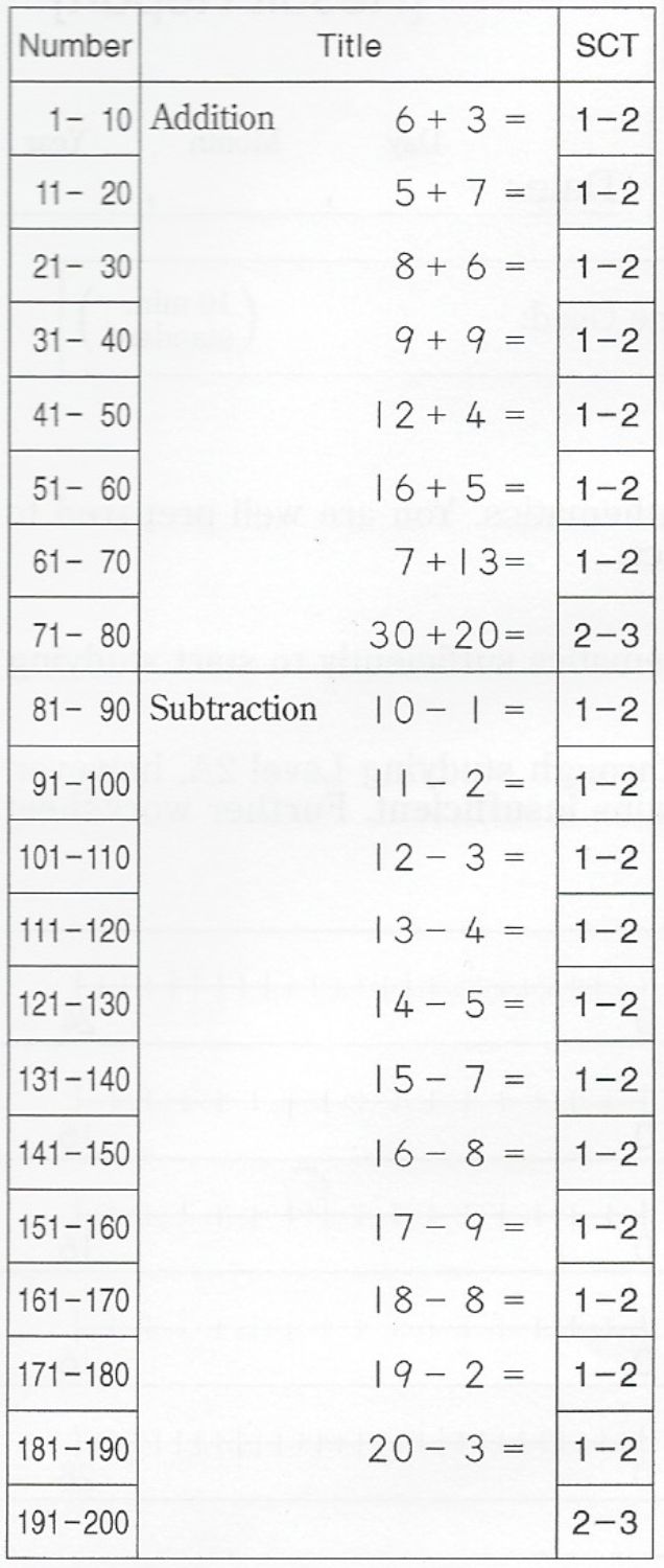 The aim of Level A is for students to develop addition and subtraction skills by using the basic addition skills they acquired up to Level 2A. This will prepare students for the vertical (column) calculations in Level B.
