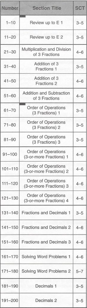 The aims of Level F are to further develop the computational skills with fractions which have been acquired in Level E to smoothly calculate more complicated problems with mixed four operations, in order to obtain the skills necessary for Level G.